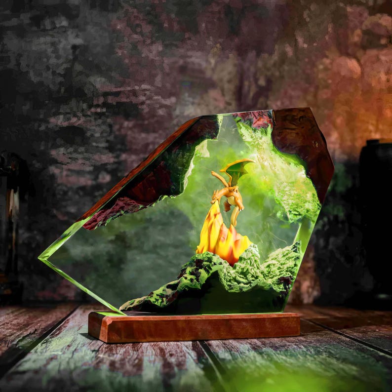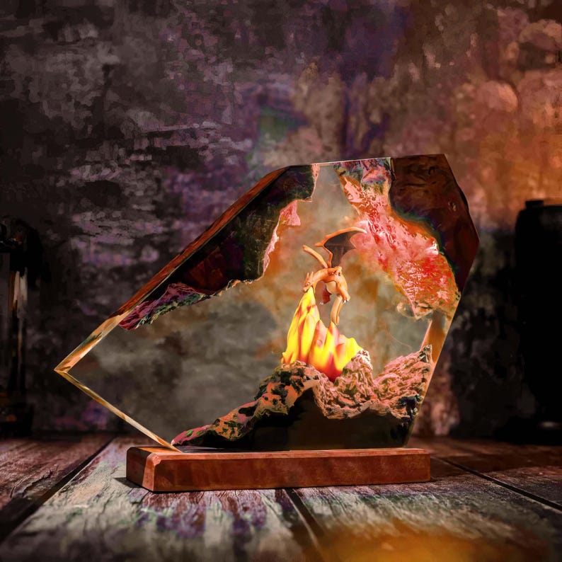 Ručno izrađena epoxy lampa inspirisana legendarnim Charizardom, kombinacija umetnosti i svetlosti u jednom savršenom dekoru.